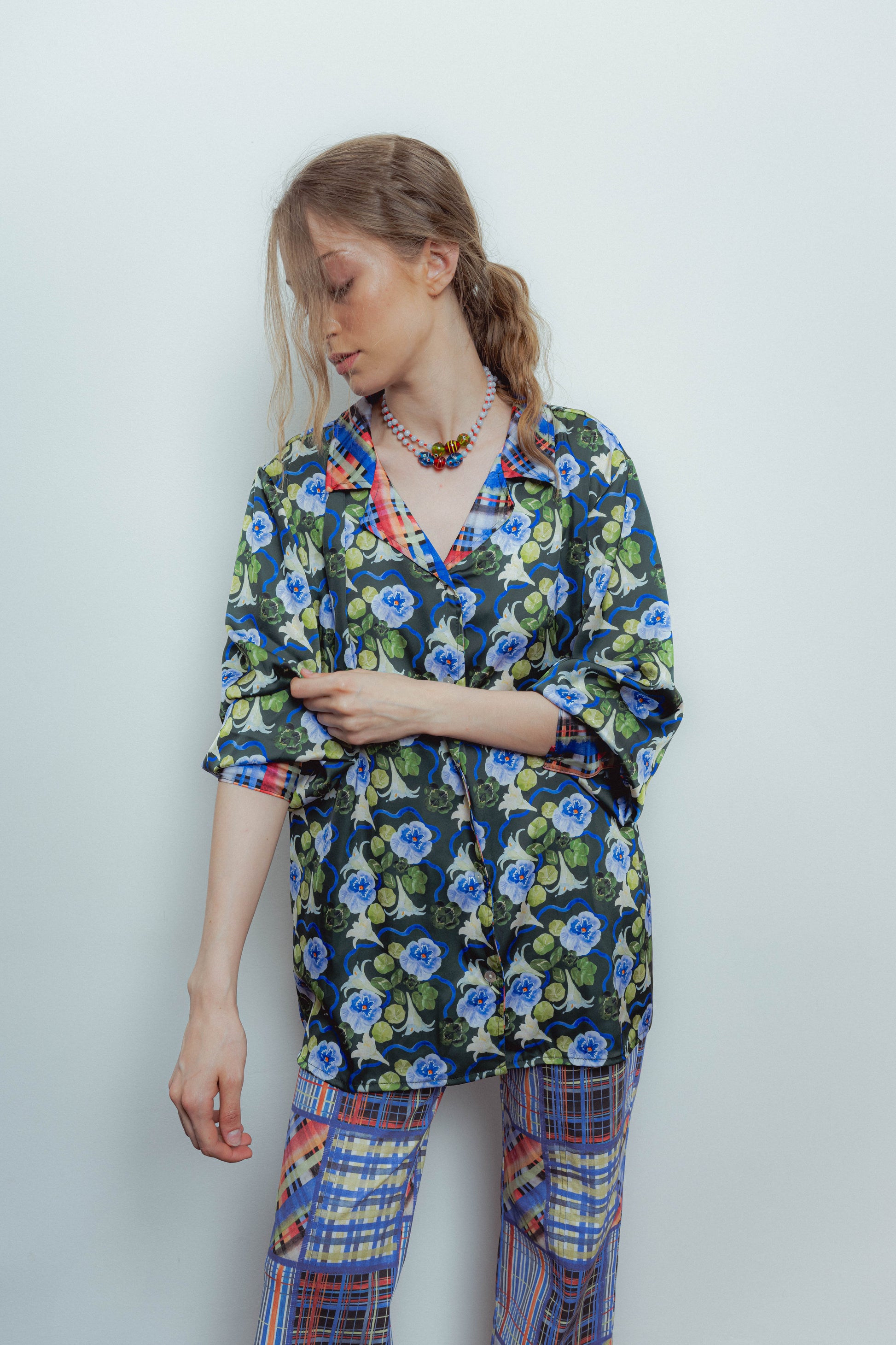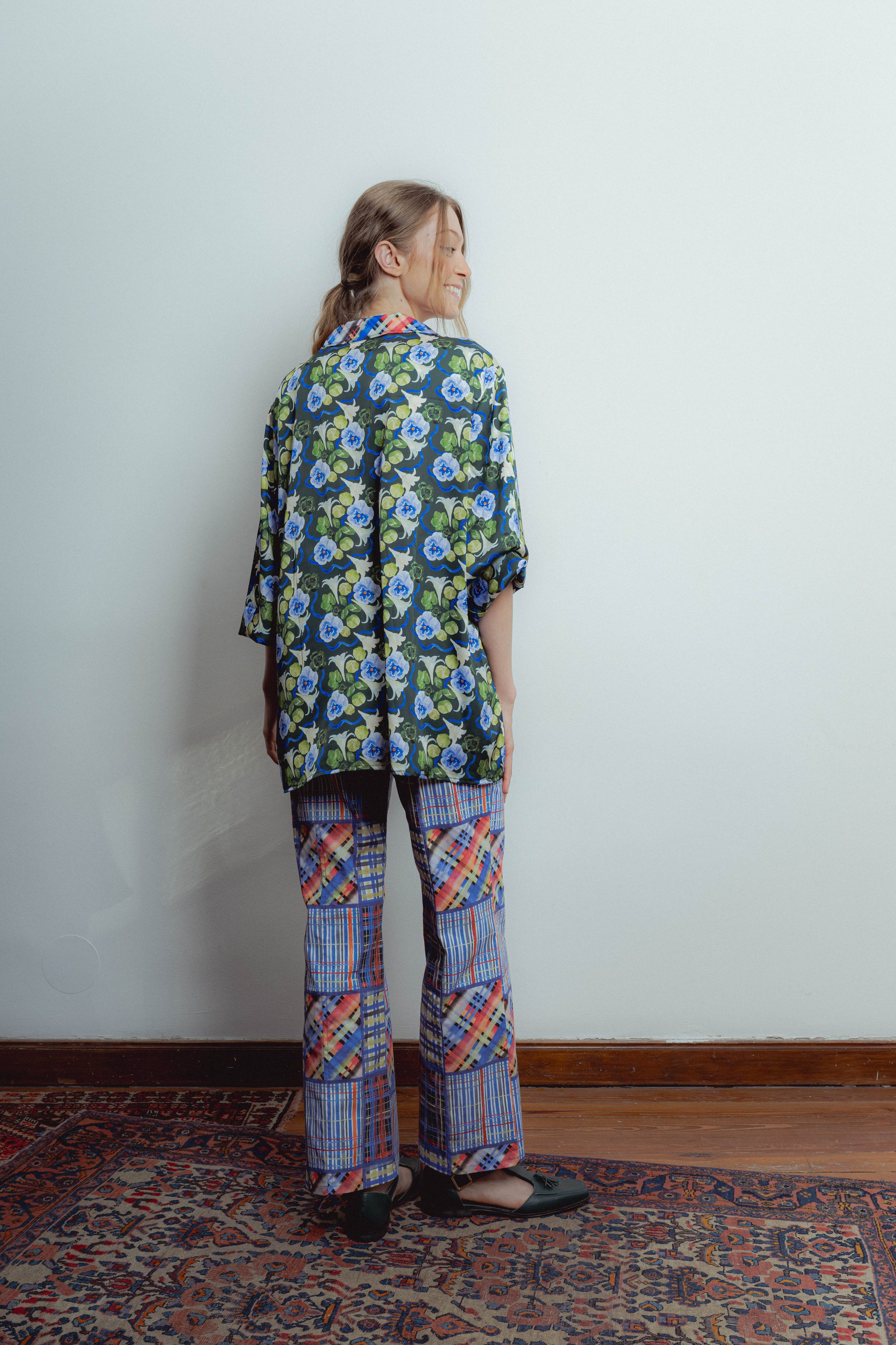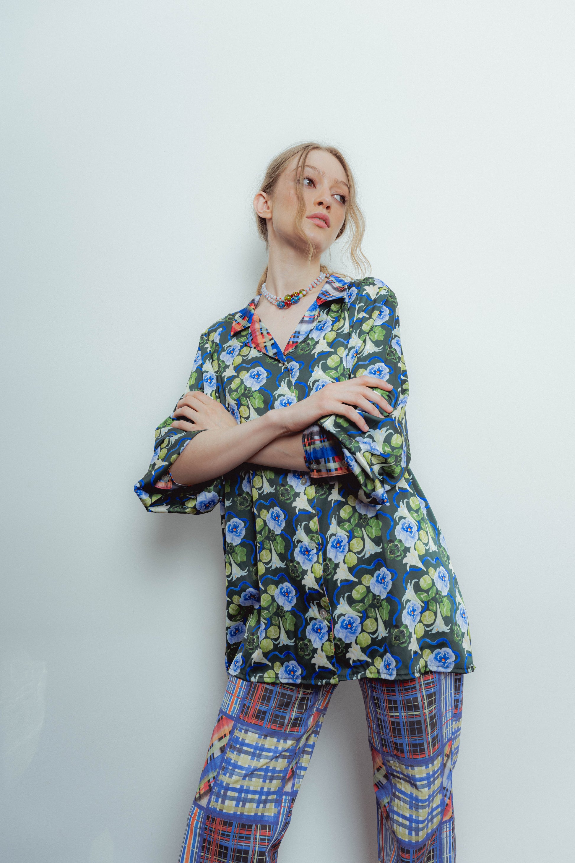 This amazing silk for a loose and flattering shirt. Buttoned up makes it super versatile. Print designed by Coppelia and handmade in Uruguay. 100% polyester.