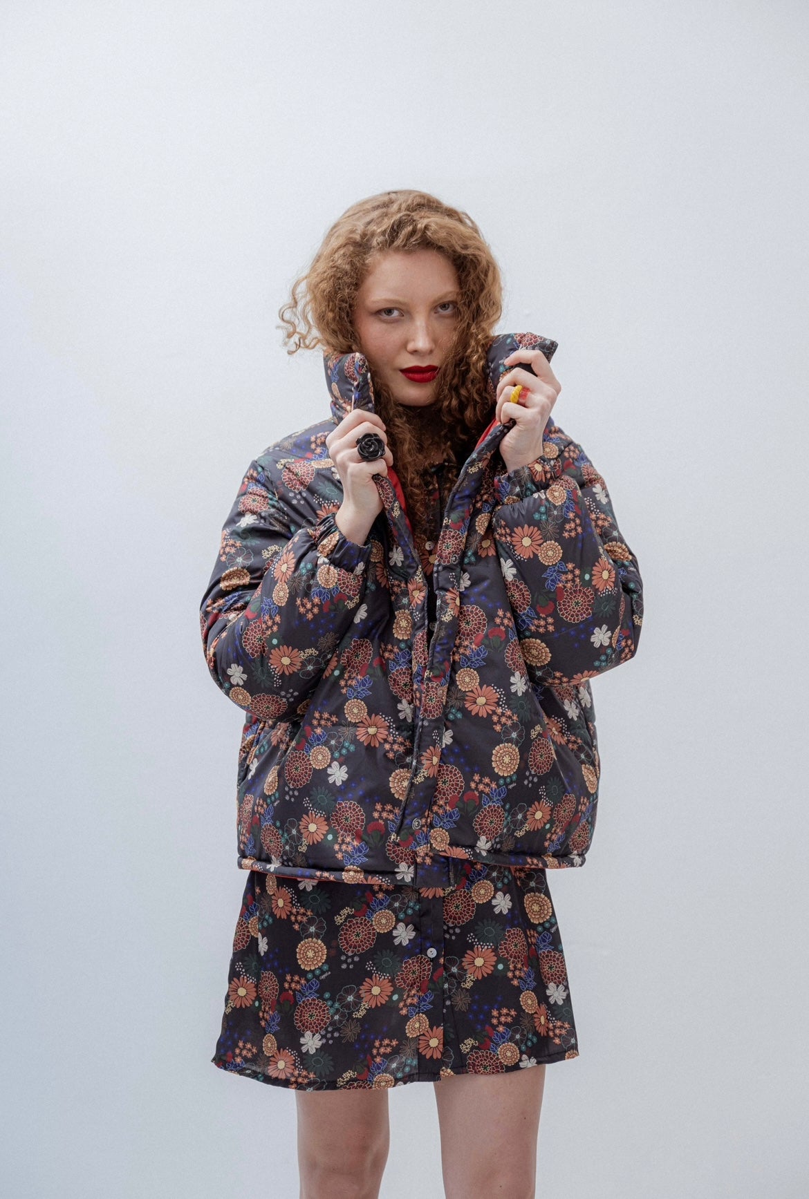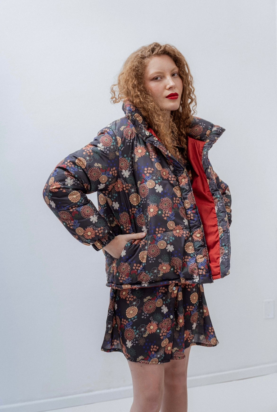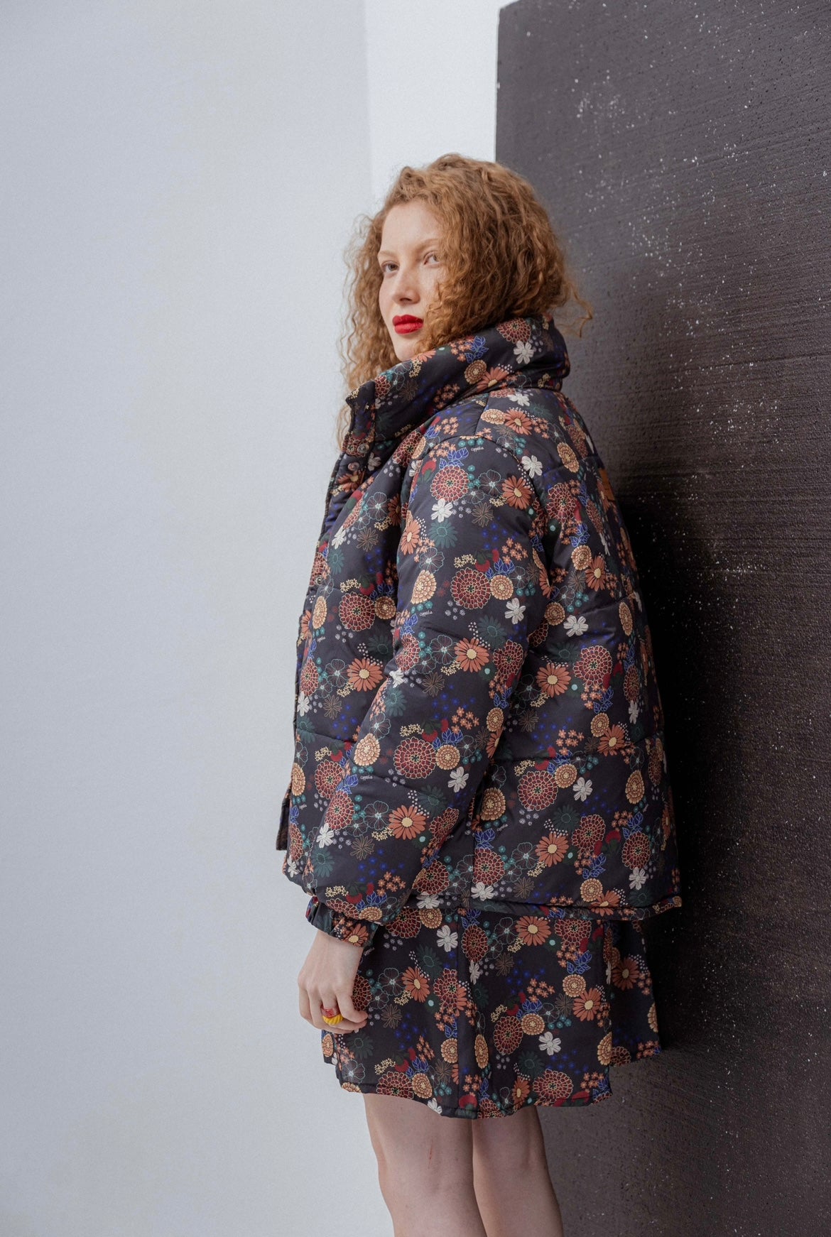 Oversized puffer jacket, buttoned up with magnets. Print designed by Coppelia and hand quilted in Uruguay.