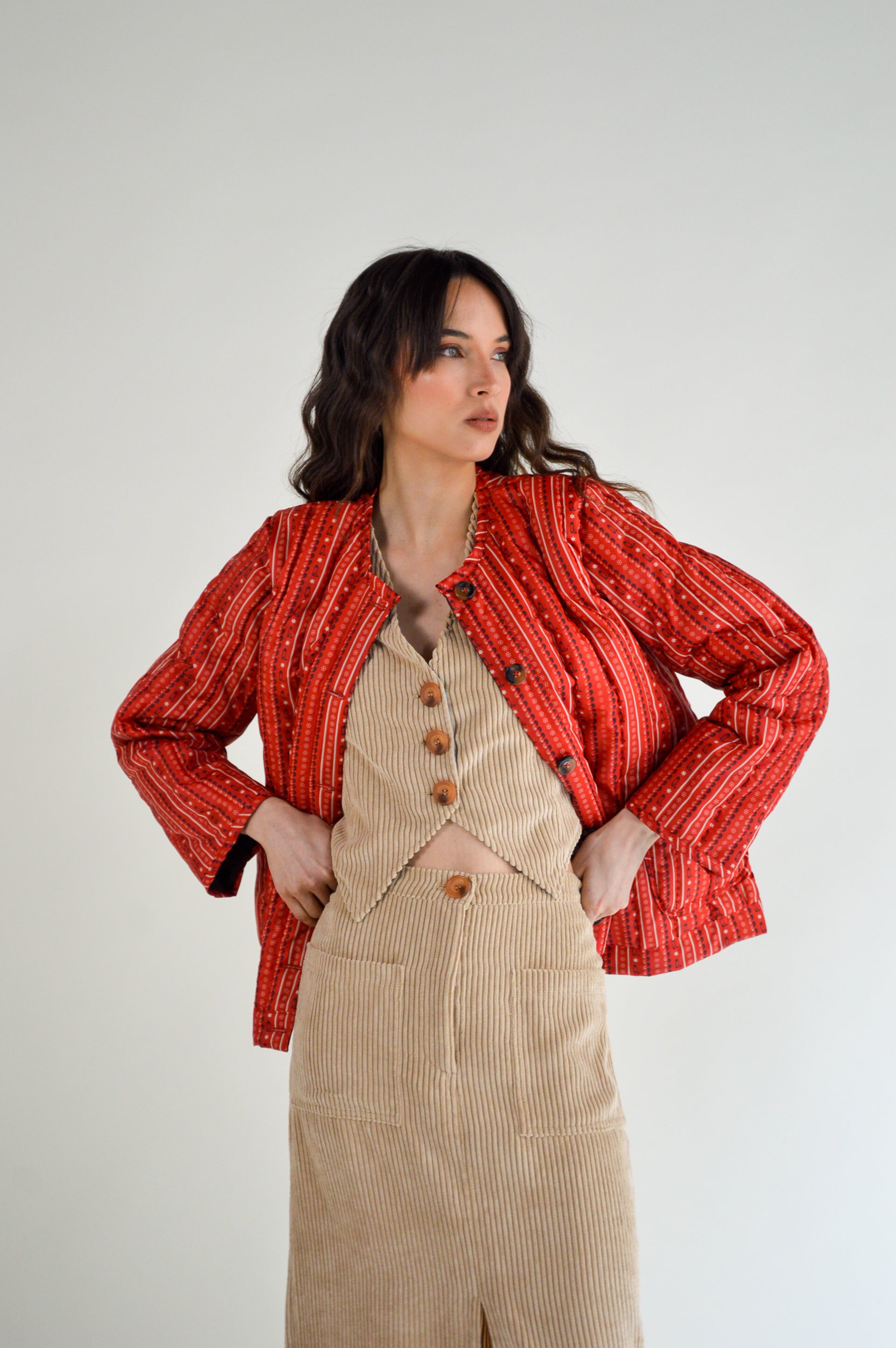 This jacket is a must-have for anyone looking to add some flair to their wardrobe. Short jacket, buttoned up. Print designed by Coppelia and hand quilted in Uruguay